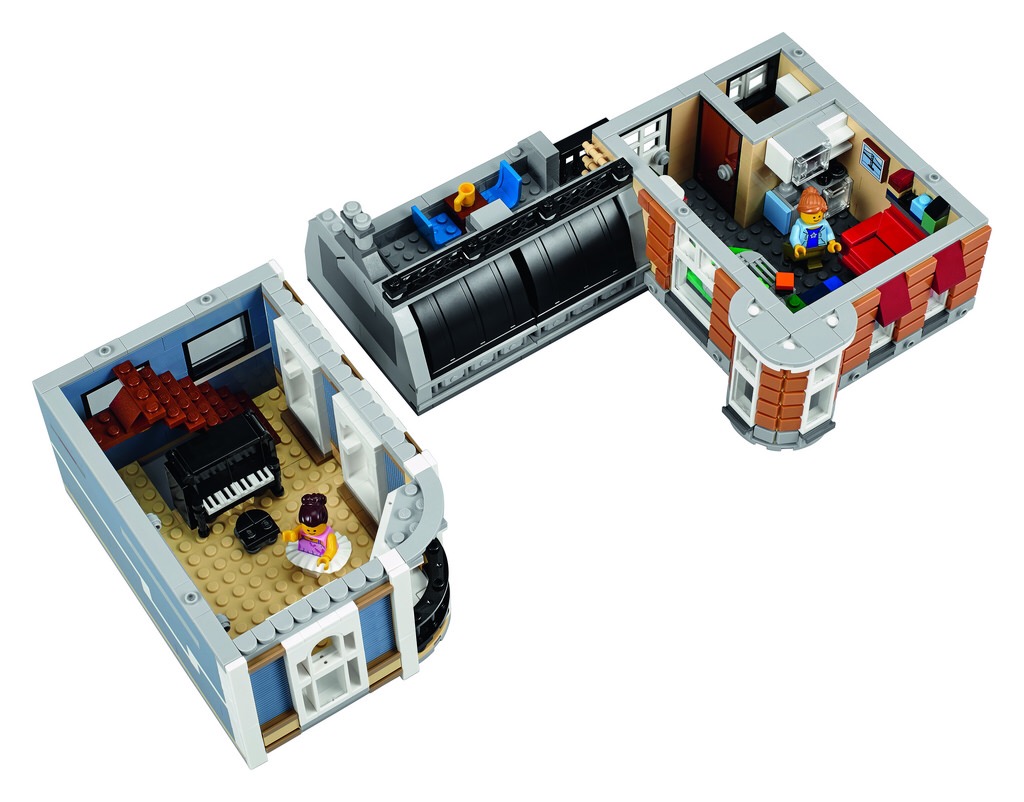 - Upper level features a dance studio with buildable piano and reflective mirror element; an apartment with buildable foldout sofa bed, detailed kitchen, toilet, micro LEGO® train, modular buildings and Eiffel Tower, and access to a rooftop terrace with buildable barbecue, table and a neglected plant.